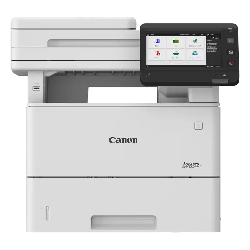 La Canon i-SENSYS MF563dw es una impresora multifunción A4 en blanco y negro ideal para pequeñas y medianas empresas. Ofrece impresión rápida de hasta 43 ppm, escaneo de hasta 100 ipm, conectividad móvil y funciones de seguridad avanzadas. Compacta, eficiente y fabricada con materiales reciclados, combina productividad, facilidad de uso y sostenibilidad en un solo equipo.